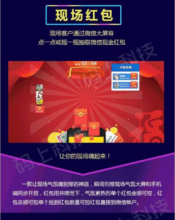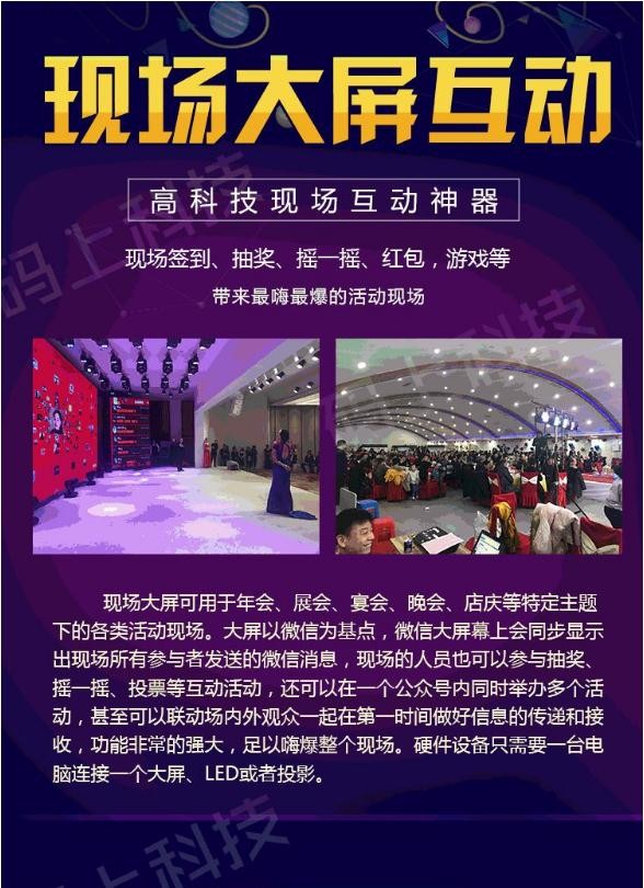現場(chǎng)大屏可用于年會(huì )、展會(huì )、宴會(huì )、晚會(huì )、店慶等特定主題下的各類(lèi)活動(dòng)現場(chǎng)。大屏以微信為基點(diǎn),微信大屏幕上會(huì )同步顯示出現場(chǎng)所有參與者發(fā)送的微信消息,現場(chǎng)的人員也可以參與抽獎、搖一搖、投票、游戲等互動(dòng)活動(dòng),還可以在一個(gè)公眾號內同時(shí)舉辦多個(gè)活動(dòng),甚至可以聯(lián)動(dòng)場(chǎng)內外觀(guān)眾一起在第一時(shí)間做好信息的傳遞和接收,功能非常的強大,足以嗨爆整個(gè)現場(chǎng)。