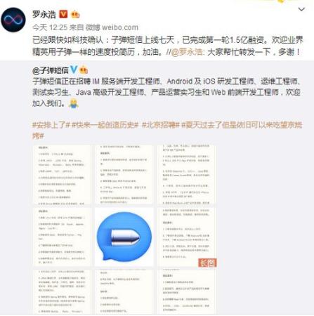 今日,錘子科技CEO羅永浩轉發(fā)關(guān)于子彈短信融資成功的微博并表示:“令人發(fā)指......上線(xiàn)才七天就完成了第一輪1.5億融資,五十多家投資機構,才見(jiàn)了不到十分之一。很多朋友已經(jīng)在勸我改行做投資和孵化器了......嗯,互聯(lián)網(wǎng)越浮躁,我們這些老一輩實(shí)業(yè)家越要耐得住寂寞。”