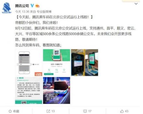 北京運行騰訊乘車(chē):騰訊乘車(chē)碼在北京公交試運行上線(xiàn)