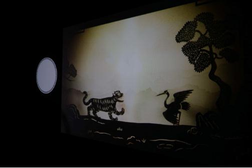 因為要體現皮影的效果,所以房間里比較暗,不好拍照。不過(guò)皮影戲確實(shí)十分有意思,看著(zhù)自己用手比出來(lái)的動(dòng)物在幕布上舞動(dòng),這種感覺(jué)還是挺有趣的。
