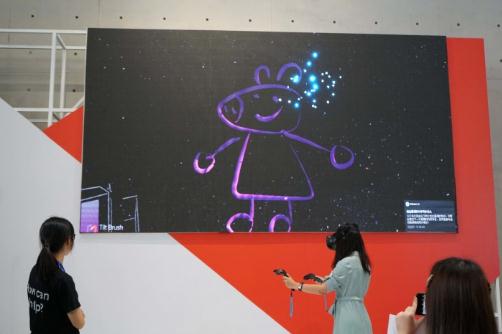 在 AI 體驗展的現場(chǎng),Google 也把這套應用搬到了線(xiàn)下。利用 VR 設備,你就可以變身為虛擬世界的造夢(mèng)人,在無(wú)限的空間里激情揮灑創(chuàng )意?,F場(chǎng)還有人用 Tilt Brush 畫(huà)了一個(gè)小豬佩奇。