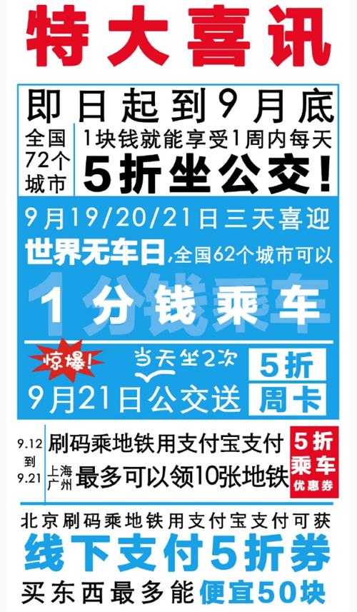此外,9 月 19/20/21 日三天喜迎世界無(wú)車(chē)日,全國 62 個(gè)城市可以 1 分錢(qián)乘車(chē)。