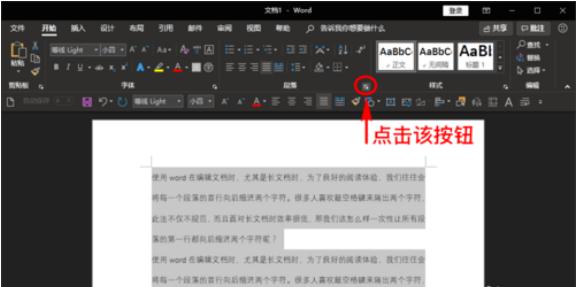 在開(kāi)始菜單的下拉子菜單中找到“段落”欄目,然后點(diǎn)擊“段落”欄右下角的擴展折疊按鈕進(jìn)入。