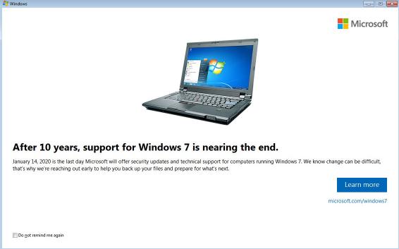 部分 Windows 7 用戶(hù)可能在上周收到了微軟的通知,這是因為微軟正式啟動(dòng)了支持到期的系統通知,通知內容是 Windows 7 即將在 2020 年 1 月 14 日終止支持。微軟提醒用戶(hù)為新版系統做準備,同時(shí)附上了詳情的鏈接按鈕。點(diǎn)擊按鈕跳轉的網(wǎng)頁(yè)提供了備份系統數據的信息,以及升級到 Windows 10 的建議。