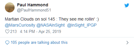 或許有些時(shí)候花點(diǎn)時(shí)間欣賞一下天空中翻滾的云朵是一件非常美好的事情,特別是在火星。本周,NASA 的洞察號探測器就拍攝到了一些來(lái)自火星的云團照。而以處理 NASA 火星照出名的公民科學(xué)家 Paul Hammond 就又通過(guò)洞察號傳回來(lái)的圖像為人們制作了一個(gè)火星翻滾云朵的動(dòng)態(tài)圖。