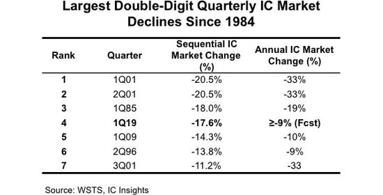 全球半導體貿易統計協(xié)會(huì )(WSTS)的最新數據顯示,2019 年第一季度全球芯片行業(yè)銷(xiāo)售額 968 億美元,相比去年同期的 1111 億美元跌了 13%,相比此前季度的 1147 億美元更是跌了 15.5%,是 35 年來(lái)整個(gè)行業(yè)第四大跌幅。