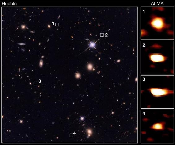 但是,斯皮策的缺點(diǎn)是它缺乏足夠高的空間分辨率來(lái)對這些星系進(jìn)行確認。因此,他們又轉向了位于智利北部沙漠中的ALMA(阿塔卡瑪毫米/亞毫米波陣列望遠鏡)的 66 個(gè)天線(xiàn)陣列。他們認為,亞毫米波段是觀(guān)察早期宇宙塵埃的最佳波段,因此推斷 ALMA 將會(huì )是觀(guān)測這類(lèi)天體的最理想設備。