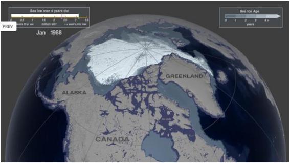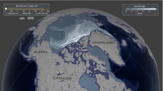這一切都說(shuō)明,氣候變化已經(jīng)是板上釘釘的事實(shí)。它并不是幾十年后子孫后人解決的問(wèn)題,而是已經(jīng)迫在眉睫、時(shí)不我待了。否認氣候變化的人常常將冰蓋融化等現象的季節性變化當作“氣候變化并非人為、而是天意”的證據。但事實(shí)并非如此。從多年冰的變化趨勢可以看出,雖然曲線(xiàn)中有自然因素導致的上下起伏,這種整體變化在 NASA 發(fā)布的視頻中體現得尤為明顯。視頻中的畫(huà)面為地球最北端,周復一周、年復一年,北極海冰的面積也在隨季節變遷不斷變動(dòng)、時(shí)多時(shí)少。視頻中冰蓋的顏色代表其存在時(shí)長(cháng),俄羅斯和加拿大地區的深藍色代表每年冬天形成、春天融化的新冰蓋,北極圈內的白色則代表存在時(shí)長(cháng)超過(guò)四年的陳舊冰蓋,介于兩者之間的淺藍色則代表時(shí)長(cháng)一年、兩年或三年的冰蓋。