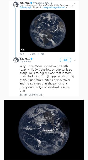 天體物理學(xué)家 Katie Mack 在 Twitter 上解釋了為什么木衛一 Io 在木星上投下的陰影是如此清晰,而月球在地球上投下的陰影看似模糊的原因。