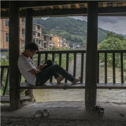 貴州省黎平縣銅關(guān)村,一名青年正在拿智能手機上網(wǎng)。