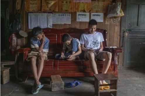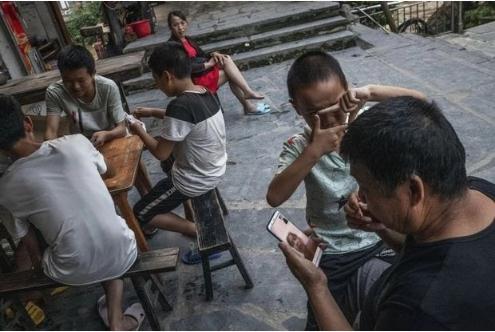 村里的孩子們正在拿智能手機上網(wǎng)打游戲。