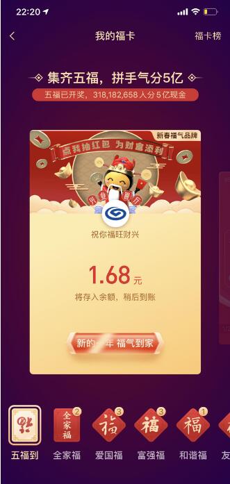 根據支付寶開(kāi)獎信息顯示,今年共有超過(guò)3億人集齊了五福,318182658人瓜分5億現金。根據網(wǎng)友截圖顯示,大部分人分到了1.68元。