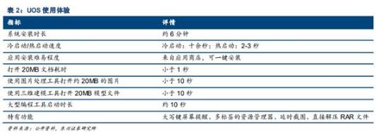 東興證券報告稱(chēng),UOS系統安裝用時(shí)約為6分鐘,冷啟動(dòng)時(shí)間十余秒,熱啟動(dòng)只要2-3秒,應用程序來(lái)自自有商店,可以一鍵安裝,使用簡(jiǎn)單。