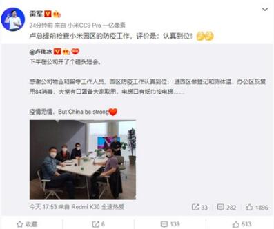近日小米集團副總裁、Redmi品牌總經(jīng)理盧偉冰在微博透露,在公司開(kāi)了個(gè)碰頭會(huì ),并對物業(yè)和留守工作人員表達了感謝。不出意外的話(huà)這也就預示著(zhù)這就是在為小米10系列的發(fā)布做準備。更關(guān)鍵的是,雷軍轉發(fā)了盧偉冰的這條微博稱(chēng):“盧總提前檢查小米園區的防疫工作,評價(jià)是:認真到位!”并且當有網(wǎng)友問(wèn)道:“雷總該檢查那啥了”時(shí),雷軍回復道:“我2/3再去檢查一下。”根據以往在發(fā)布前一周開(kāi)始正式預熱的習慣,我們推測,小米10的發(fā)布會(huì )可能并不會(huì )受到影響,且發(fā)布時(shí)間很可能就在此前預計的2月10日。