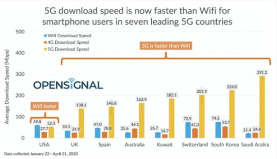 Opensignal 的數據顯示,在下一代移動(dòng)技術(shù)已被成熟部署的八個(gè)國家中,有七個(gè)國家的 5G 網(wǎng)絡(luò )的下行數據速率比 Wi-Fi 快得多。沙特阿拉伯的 5G 速度最快,典型的下載速度為 291.2Mb/s,而 Wi-Fi 的下載速度為 21.4Mb/s,其次是韓國、瑞士、科威特、澳大利亞、西班牙和英國。