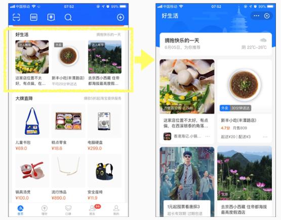 6 月 5 日,支付寶首頁(yè)再次升級,新增加了“好生活”板塊,首次以瀑布流的方式展示各類(lèi)生活服務(wù),目前已在北京、上海、杭州等地先行上線(xiàn)。