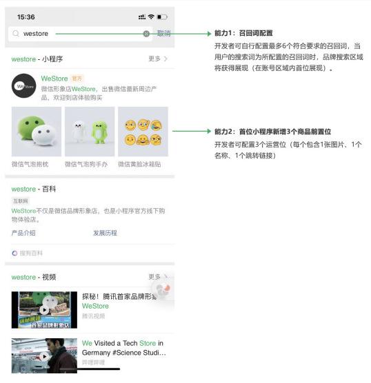 通過(guò)通用品牌認證后,品牌可自行配置最多 6 個(gè)符合要求的召回詞,當用戶(hù)在微信“發(fā)現-小程序”搜索框輸入品牌配置好的召回詞后,即可看到品牌搜索區域。而通過(guò)電商品牌認證的品牌,除了擁有和通用品牌認證一樣的召回詞配置能力外,還可在小程序搜索結果中配置 3 個(gè)商品運營(yíng)位,用戶(hù)可直接點(diǎn)擊跳轉至相應的商品頁(yè)面。
