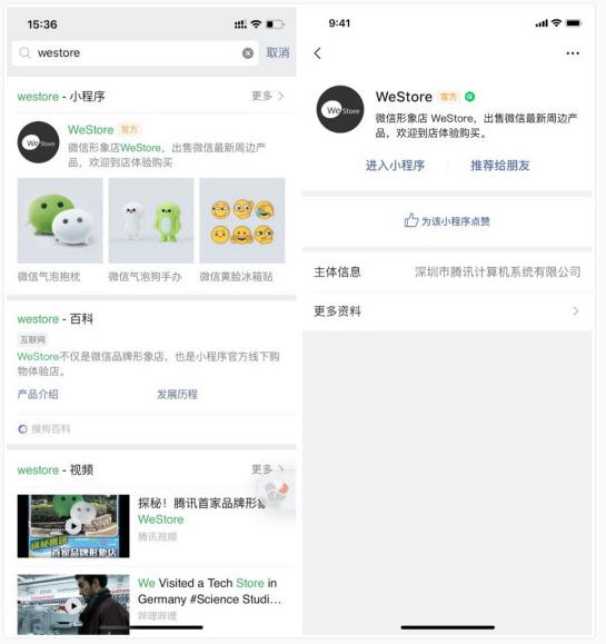 以小程序 WeStore 為例,當用戶(hù)在“發(fā)現-小程序”頂部搜索框輸入微信周邊、微信氣泡狗手辦等召回詞時(shí),小程序賬號的搜索結果將首位展示小程序 WeStore。