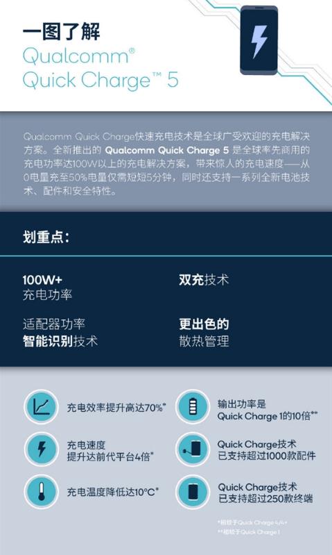 這次的 QC 5.0 可以說(shuō)全方位升級,首先快充功率提升到了 100W+,號稱(chēng)智能手機中 100W 以上充電功率的首個(gè)商用快充平臺,5 分鐘可以從0% 充到 50%,充電效率提升 70%,速度是前代的 4 倍。