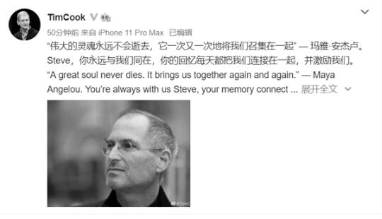 去年的今天,庫克曾在微博發(fā)文稱(chēng),“我們所有人最寶貴的資源就是時(shí)間” ;再向前追溯,則有“Steve 讓我以及所有人懂得了人文關(guān)懷的意義,我們懷念他,每時(shí)每刻,他為我們樹(shù)立的榜樣牢記于心”;到了 2017 年,為其言在耳,激勵吾輩:“創(chuàng )造神奇,以饗世人。”