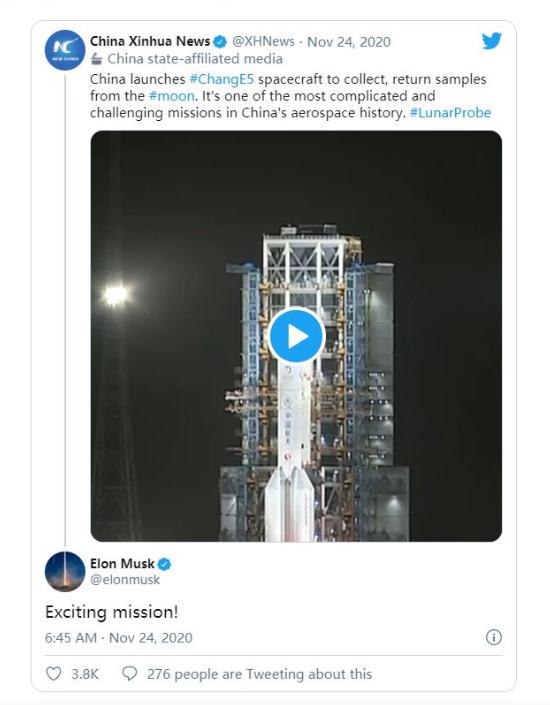 馬斯克在推文中回應了中國媒體的報道,并贊揚了中國最新的登月努力。他說(shuō),嫦娥五號發(fā)射是“令人興奮的任務(wù)”。