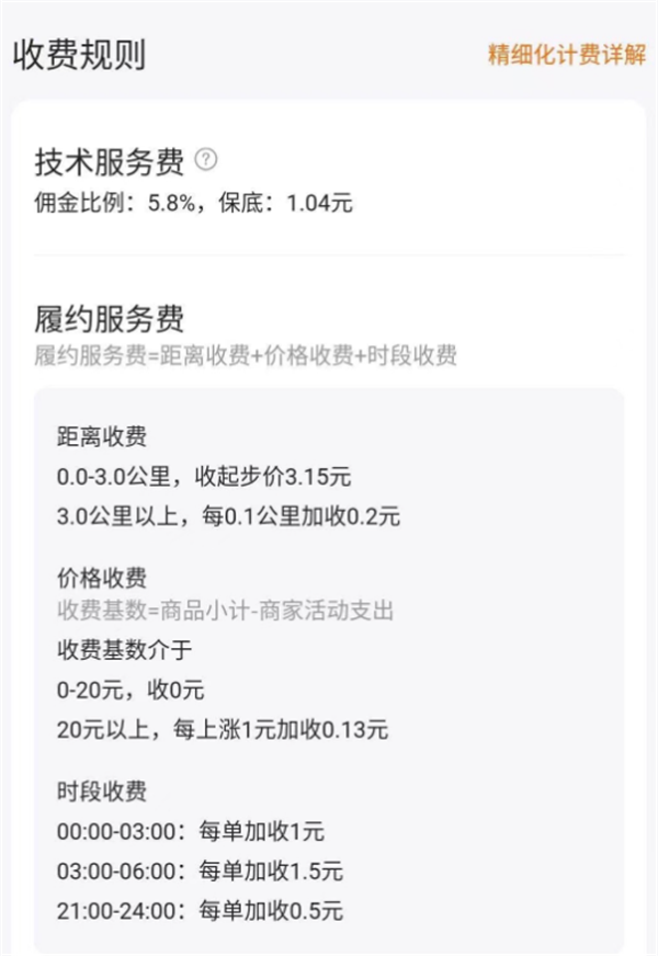 前幾天美團把對商戶(hù)的費率進(jìn)行了更改,把原來(lái)的固定的傭金拆分為較低的技術(shù)服務(wù)費和履約服務(wù)費。對于3公里以上的訂單和深夜凌晨等特殊時(shí)段,又采用了階梯式收費。