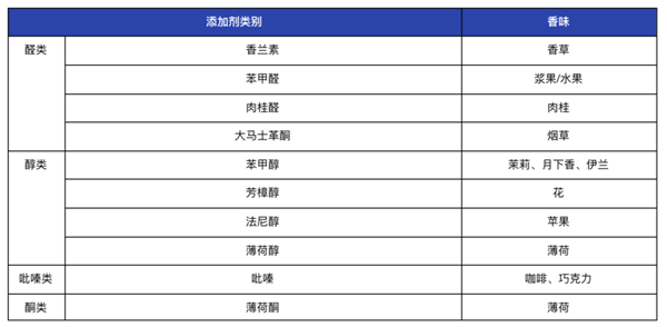 電子煙的煙油含有多種香味添加劑,按照化學(xué)元素類(lèi)別可分為醛類(lèi)、醇類(lèi)、吡嗪、酮類(lèi),以及包括乙基麥芽醇在內的甜味劑(如下圖表)。