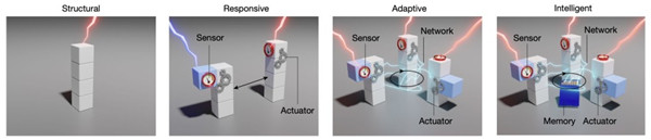 研究人員認為,可以通過(guò)用分層的方式定義人工物質(zhì)的智能。比如,通過(guò)結合四個(gè)關(guān)鍵功能元件來(lái)實(shí)現智能物質(zhì):(1)傳感器與環(huán)境交互并接收輸入和反饋;(2)執行器對輸入信號做出響應并調整材料的性能;(3) 用于長(cháng)期存儲信息的存儲器;(4)用于處理反饋的通信網(wǎng)絡(luò )。