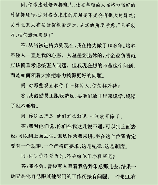 其實(shí),關(guān)于接班人的話(huà)題,董明珠最早的回答應該還在出書(shū)時(shí)代。在2006年出的《行棋無(wú)悔》一書(shū)里,有人問(wèn)她接班人: