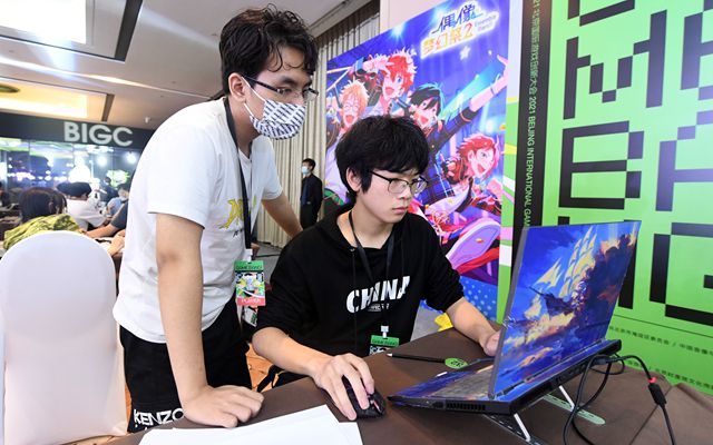 7 月,2021 北京國際游戲創(chuàng )新大會(huì )創(chuàng )作大賽開(kāi)賽,一電子游戲設計團隊的隊員討論游戲設計方案。新華社
