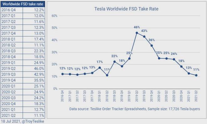 一項針對 1.7 萬(wàn)多名特斯拉買(mǎi)家的調查顯示,目前特斯拉 FSD 套件在全球特斯拉車(chē)主中的普及率僅為 11% 左右。最高點(diǎn)是在 2019 年,當時(shí) FSD 套件的普及率達到了 46%。