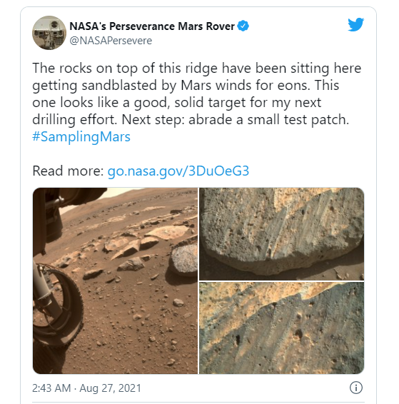 NASA 已將目光鎖定在一塊綽號為"Rochette"的巖石上。漫游車(chē)將用一個(gè)研磨工具對巖石進(jìn)行一些粗加工,以獲得更好的外觀(guān),并幫助團隊決定這是否確實(shí)是他們想要采樣的巖石。如果可以的話(huà),漫游車(chē)將鉆進(jìn)巖石,收集一個(gè)鉛筆厚的核心部分,并將其封入一個(gè)樣品管。