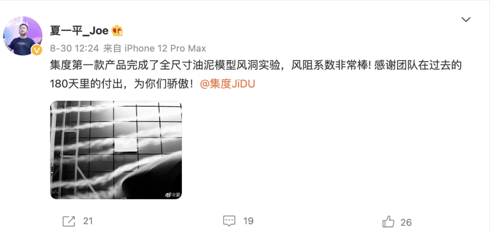 這里,我們不妨看看隔壁“百度汽車(chē)”的造車(chē)進(jìn)度。百度旗下造車(chē)品牌集度汽車(chē) CEO 夏一平,在微博發(fā)布首款汽車(chē)產(chǎn)品風(fēng)洞圖,并稱(chēng):“集度第一款產(chǎn)品完成了全尺寸油泥模型風(fēng)洞實(shí)驗,風(fēng)阻系數非常棒!感謝團隊在過(guò)去 180 天的付出,為你們驕傲!”。