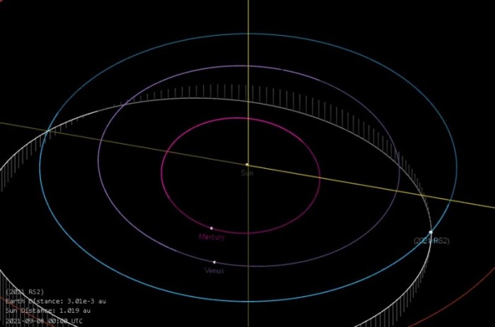 根據美國航空航天局(NASA)網(wǎng)站消息,北京時(shí)間 9 月 8 日下午 3 時(shí) 28 分左右,今年以來(lái)距離地球最近的一顆小行星與人類(lèi)擦肩而過(guò),最靠近時(shí)甚至比很多人造地球衛星更近。NASA 下屬的噴氣推進(jìn)實(shí)驗室提供的數據顯示,這顆編號 2021 RS2 的小行星于 9 月 7 日才被發(fā)現,它的體積約卡車(chē)大小,估計直徑在 2.3-5.1 米左右。