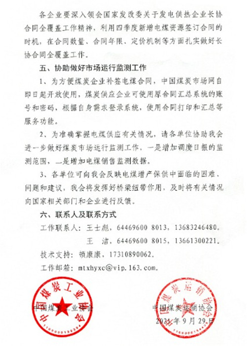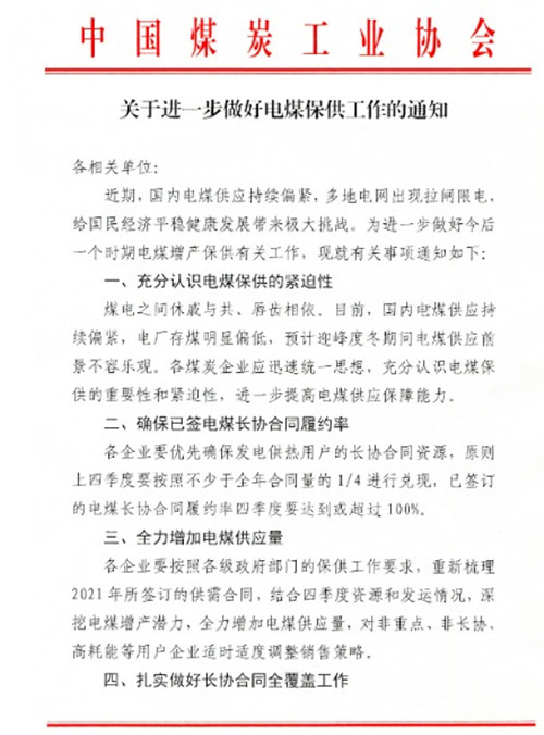 9月30日,中國煤炭工業(yè)協(xié)會(huì )、中國煤炭運銷(xiāo)協(xié)會(huì )發(fā)布通知,要求進(jìn)一步做好電煤保供工作,要求各企業(yè)要深挖電煤增產(chǎn)潛力,全力增加電煤供應量,各企業(yè)要優(yōu)先確保發(fā)電供熱用戶(hù)的長(cháng)協(xié)合同資源,原則上四季度要按照不少于全年合同量的1/4進(jìn)行兌現,已簽訂的電煤長(cháng)協(xié)合同履約率四季度要達到或超過(guò)100%。