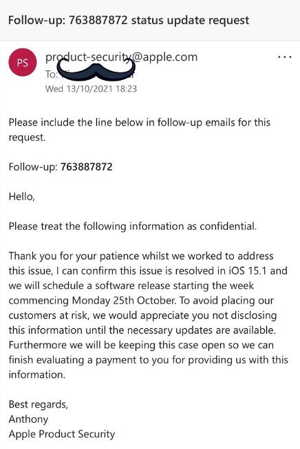 蘋(píng)果方面爽快承認了這個(gè)問(wèn)題,并表示會(huì )在 iOS 15.1 中得到修復。同時(shí)要求 @RobertCFO 對郵件和漏洞利用細節保密,直到補丁正式推出。