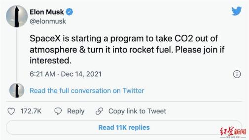 據外媒報道,在馬斯克當選《時(shí)代》年度人物之際,他在推特上發(fā)文透露,SpaceX 公司正式啟動(dòng)一項新的計劃,將大氣中的二氧化碳轉化為火箭燃料。他聲稱(chēng)該計劃對未來(lái)的火星探索很重要,專(zhuān)注于減少大氣中的二氧化碳,可以為地球和航天公司取得雙贏(yíng)。
