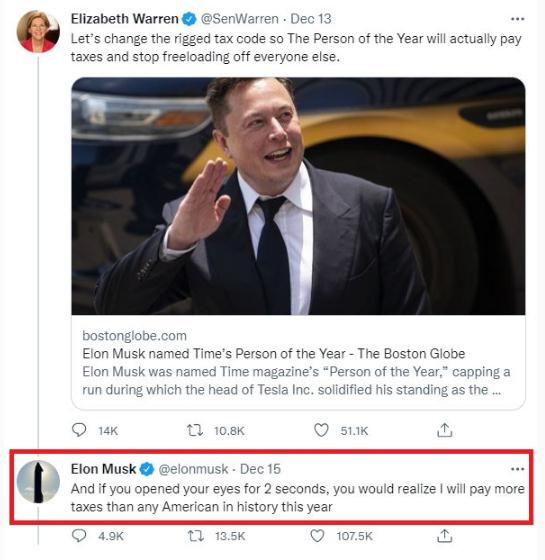 近日,據媒體報道,特斯拉 CEO 埃隆·馬斯克最近在回應美國參議員伊麗莎白-沃倫對他納稅問(wèn)題的批評時(shí)聲稱(chēng),“只需睜開(kāi)眼睛 2 秒鐘,就能知道我今年的納稅金額將超過(guò)歷史上任何一個(gè)美國人“。