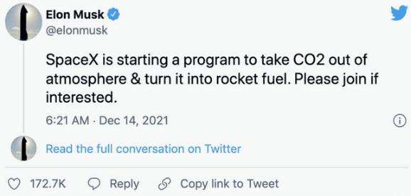對于可持續能源領(lǐng)域的突破和成就,馬斯克去年12月曾在社交媒體上發(fā)文透露,SpaceX公司正式啟動(dòng)一項新的計劃,將大氣中的二氧化碳轉化為火箭燃料。他聲稱(chēng)該計劃對未來(lái)的火星探索很重要,專(zhuān)注于減少大氣中的二氧化碳,可以為地球和航天公司取得雙贏(yíng)。