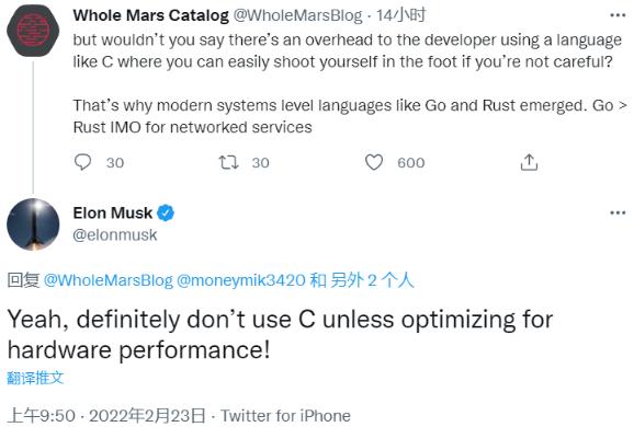 馬斯克回復稱(chēng),他也是 Rust 的粉絲,十分認可 Rust 的擴展性。不過(guò)為了獲得最大化的性能,最好的方案還是在專(zhuān)門(mén)的硬件上使用包含定制編譯器的 C 語(yǔ)言。這對汽車(chē)上的推斷計算機上的最大幀率 (max frame rate) 十分重要。其他場(chǎng)景他們主要使用 C++ 和 Python。他還強調道,除非需要針對硬件性能進(jìn)行優(yōu)化,否則絕對不要使用 C!