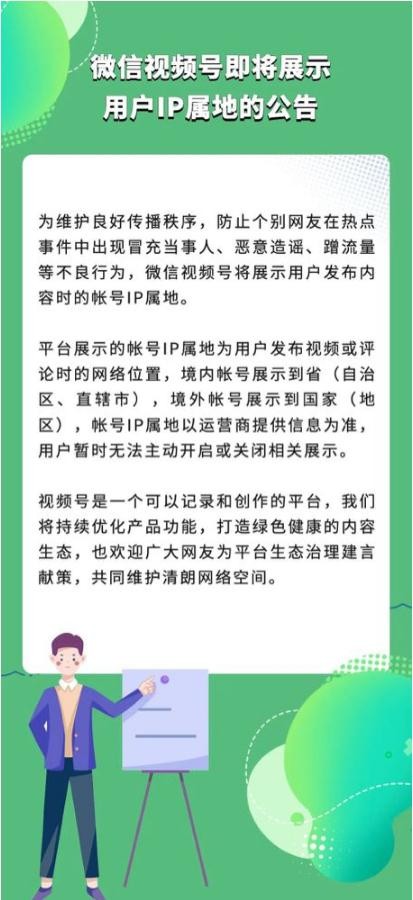 5 月 20 日,“微信珊瑚安全”微信公眾號發(fā)布公告稱(chēng),微信視頻號將展示用戶(hù)發(fā)布內容時(shí)的帳號 IP 屬地。平臺展示的帳號 IP 屬地為用戶(hù)發(fā)布視頻或評論時(shí)的網(wǎng)絡(luò )位置,境內帳號展示到省(自治區、直轄市),境外帳號展示到國家(地區),帳號 IP 屬地以運營(yíng)商提供信息為準,用戶(hù)暫時(shí)無(wú)法主動(dòng)開(kāi)啟或關(guān)閉相關(guān)展示。