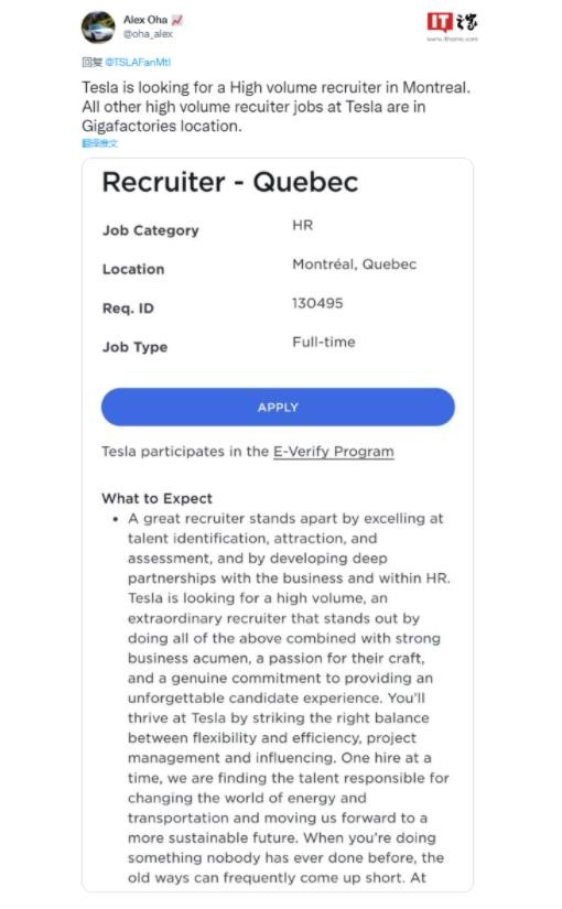 據 TESLARATI 今日報道,推特用戶(hù) Alex Oha 發(fā)現,特斯拉正在加拿大蒙特利爾招聘 HR,該 HR 將負責大量招聘員工。與一般 HR 不同,特斯拉僅在已經(jīng)建立超級工廠(chǎng)的地方招聘此類(lèi) HR,例如美國得克薩斯州和德國柏林。因此,這暗示著(zhù)特斯拉將在加拿大蒙特利爾新建超級工廠(chǎng)。
