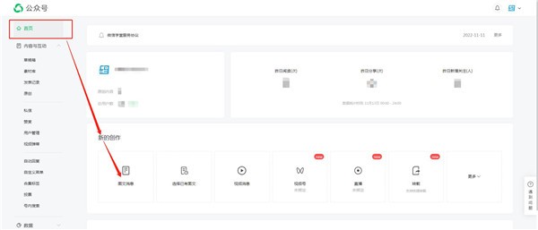 2.在左側首頁(yè)標簽里找到新的創(chuàng )作--圖文消息,然后點(diǎn)擊進(jìn)入。