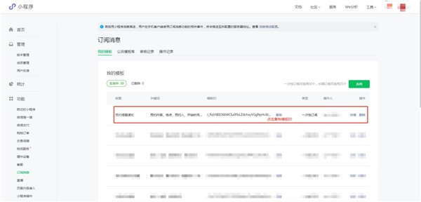 5.添加成功后我們就可以看到訂閱消息列表就有了這一條剛添加的信息,點(diǎn)擊復制模板ID,粘貼到程序里需要的位置即可使用成功。