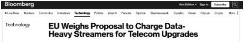 該提案是歐盟執行機構從“公平分享”(fair-share)的愿景出發(fā)提出的,該愿景要求提供流媒體視頻和其他數據密集型服務(wù)的大型科技企業(yè)幫助支付它們產(chǎn)生的流量。
