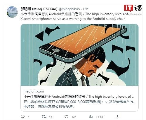 就在 3 天前,郭明錤指出,小米智能手機的 2023 年出貨量可能將低于市場(chǎng)預期,且目前小米庫存高達 12–16 周,顯示市場(chǎng)對小米 / Android 手機出貨動(dòng)能復蘇仍過(guò)于樂(lè )觀(guān)。