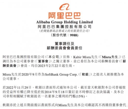 公告稱(chēng),米斯拉在 2020 年 9 月作為軟銀的提名人被推選為公司董事。2022 年 11 月 29 日,軟銀以書(shū)面形式通知阿里,截至當天,軟銀對阿里普通股的受益所有權已降至低于按 2014 年 9 月 18 日簽訂并不時(shí)修訂之表決協(xié)議,及本公司章程相關(guān)賦予軟銀提名一名董事之權利的門(mén)檻(15%)。軟銀也于上述日期前后以書(shū)面形式向米斯拉及阿里確認其不再維持董事會(huì )代表,米斯拉也確認終止在董事會(huì )代表軟銀的身份。