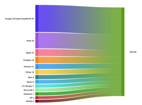 LeadGenius 和 Punks & Pinstripes 的數據顯示,該公司兩百多名員工中有許多來(lái)自 Alphabet 公司。數據顯示,OpenAI 目前雇傭了約 59 名前谷歌員工和約 34 名前 Meta 員工。該公司還雇傭了幾名前蘋(píng)果和亞馬遜員工。