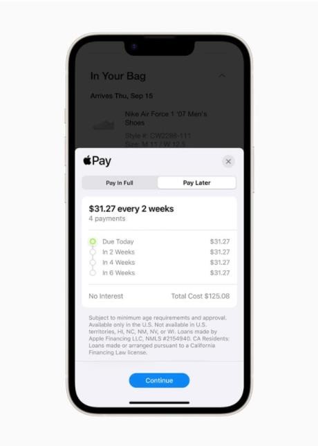 蘋(píng)果今天在美國推出了 Apple Pay Later 服務(wù),將允許消費者先購物后付費。簡(jiǎn)單來(lái)說(shuō),Apple Pay 用戶(hù)可以將某一筆賬單分成四筆在六周內付款,零利息且不收取任何額外費用。