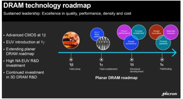 美光 1γ 制造技術(shù)中原定于 2024 年的某個(gè)時(shí)候推出,但因為美光必須在 2023 和 2024 財年減少新設備的支出,并減少 DRAM bit 出貨量,它將不得不放慢 DRAM 在其 1β 和 1γ 制造技術(shù)上的增長(cháng)速度,目前 1γ nm 制程已被推遲到 2025 年。